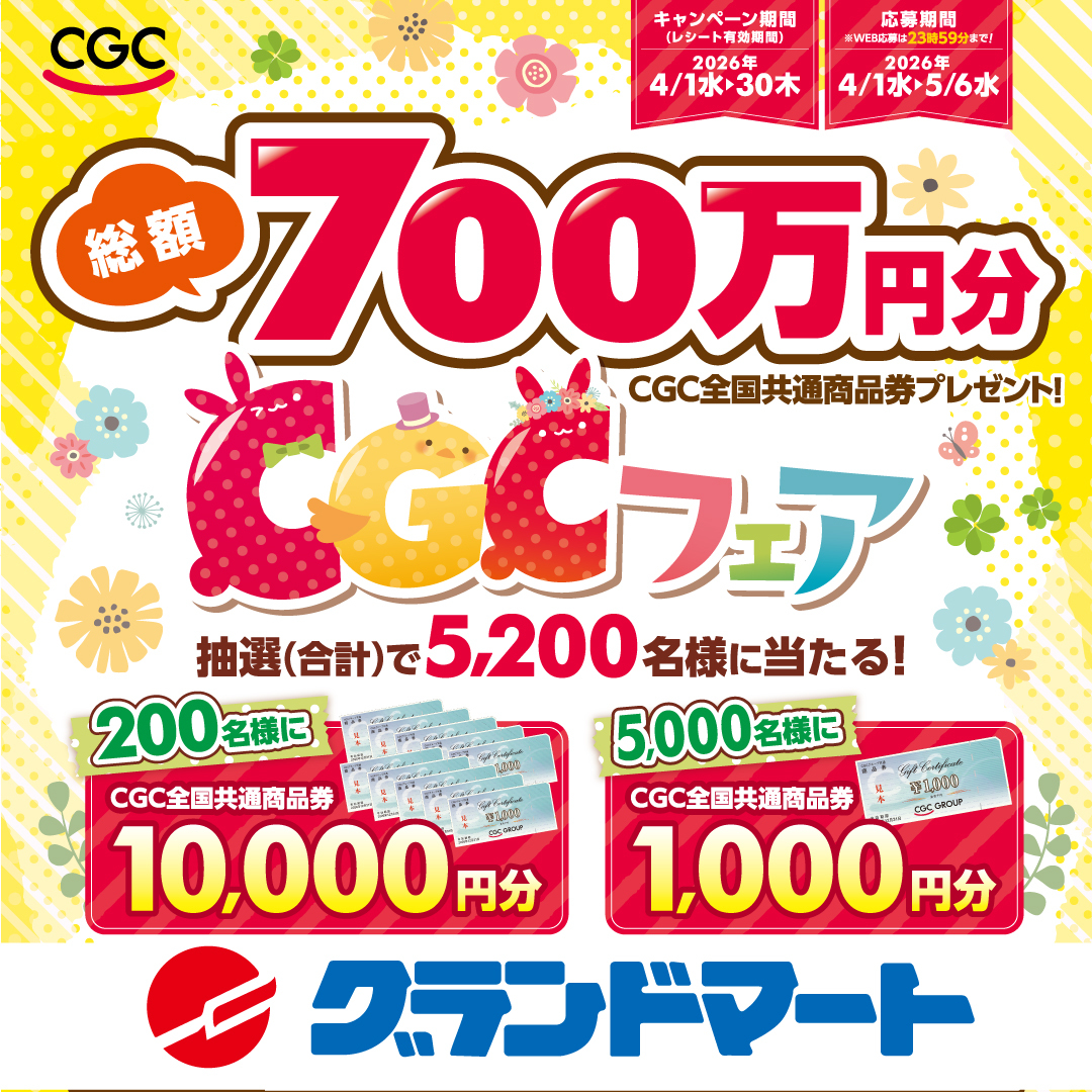 さらに!今回は津高店限定で4月11日(土)・4月12日(日)の2日間、税込3,000円以上お買い上げのすべてのお客様に、グランドマート津高店で使える100円引き券を発行します!100円引き券は1,000円以上お買い上げでご利用いただけます。使用期間は4月13日から4月30日まで。